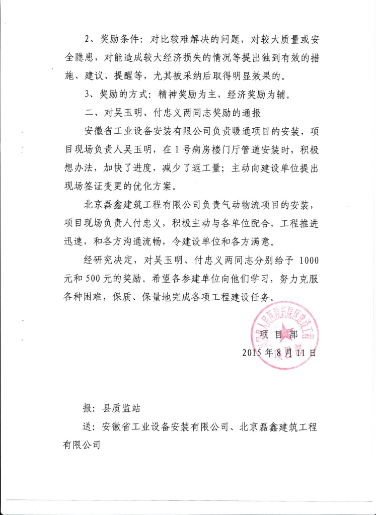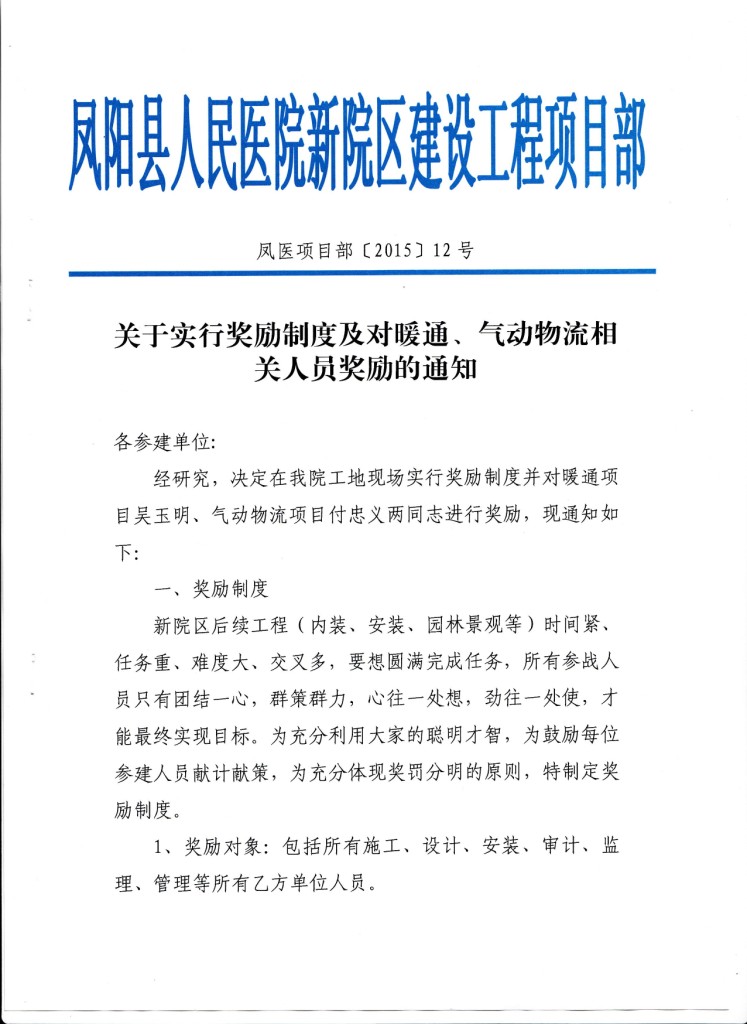 8月11日,鳳陽(yáng)縣人民醫院新院區建設工程項目部發(fā)來(lái)賀文,就公司第九分公司承攬的鳳陽(yáng)縣人民醫院新院區暖通項目安裝工程表示肯定,并對該項目的現場(chǎng)負責人吳玉明同志給予表彰和獎勵通報。