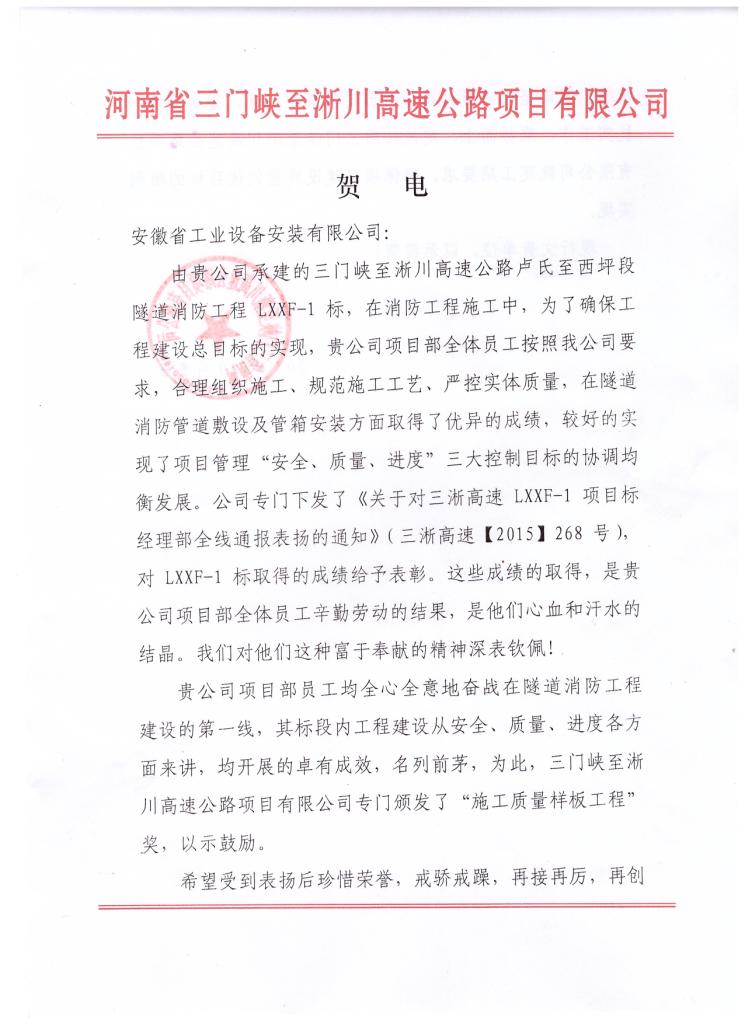 10月5日,公司收到河南省三門(mén)峽至淅川高速公路項目有限公司發(fā)來(lái)的賀電,信中對公司西北分公司在承建三門(mén)峽至淅川高速公路盧氏至西坪段隧道消防工程LXXF-1標施工中,項目部合理組織施工、規范施工工藝、嚴控實(shí)體質(zhì)量,較好地實(shí)現了項目“安全、質(zhì)量、進(jìn)度”三大控制目標協(xié)調均衡發(fā)展表示高度贊揚,對項目部全體員工辛勤勞動(dòng)、無(wú)私奉獻表示衷心感謝,并給予表彰和獎勵。