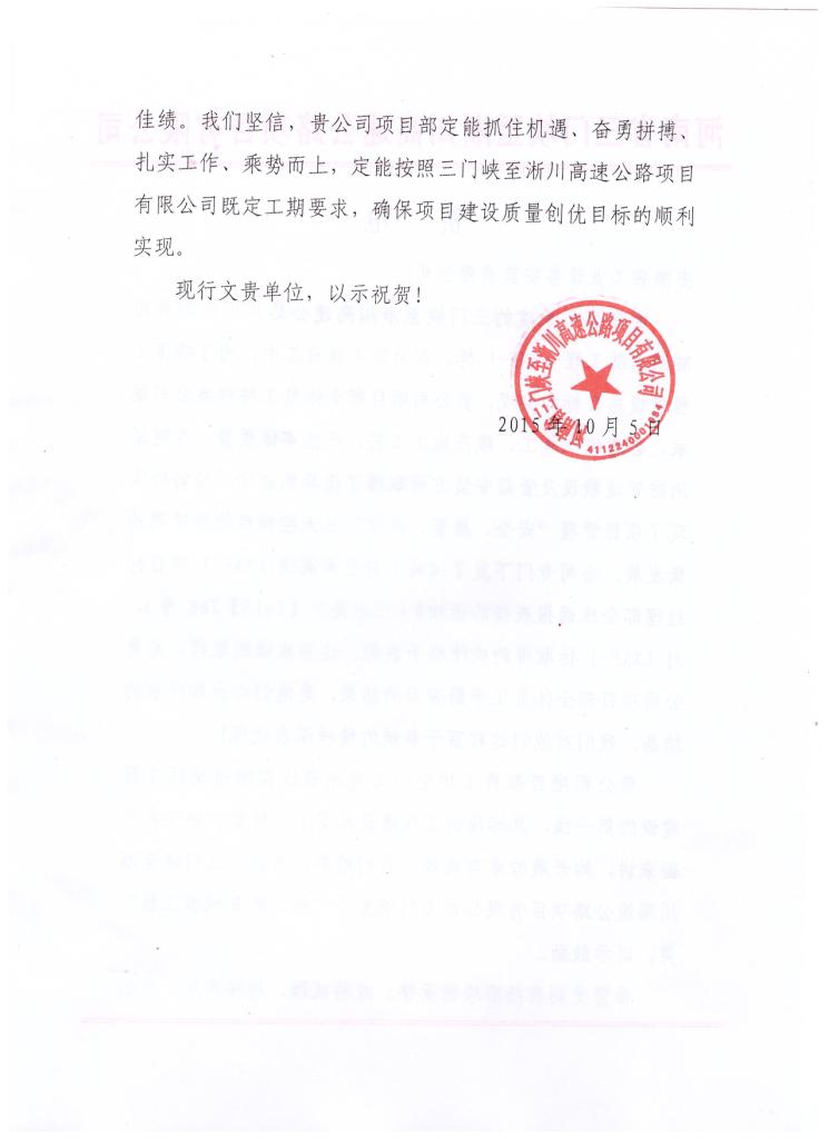 河南省三門(mén)峽至淅川高速公路項目有限公司向公司發(fā)來(lái)賀電