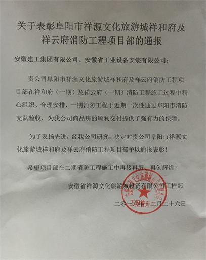 第四分公司阜陽(yáng)市祥源文化旅游城消防工程項目部受到業(yè)主單位通報表彰