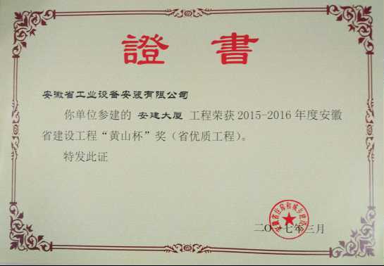 日前,2015-2016年度安徽省建設工程“黃山杯”(省優(yōu)質(zhì)工程)獲獎工程項目名單公布,公司參建的“安建大廈”通過(guò)形式審查、現場(chǎng)復查、評審委員會(huì )評審等程序,同獲該項殊榮。至此,公司榮獲“黃山杯”達11尊。同時(shí)“濱湖中心1-3#樓空調系統工程 ”還榮獲2017年度中國安裝工程優(yōu)質(zhì)獎(中國安裝之星)。