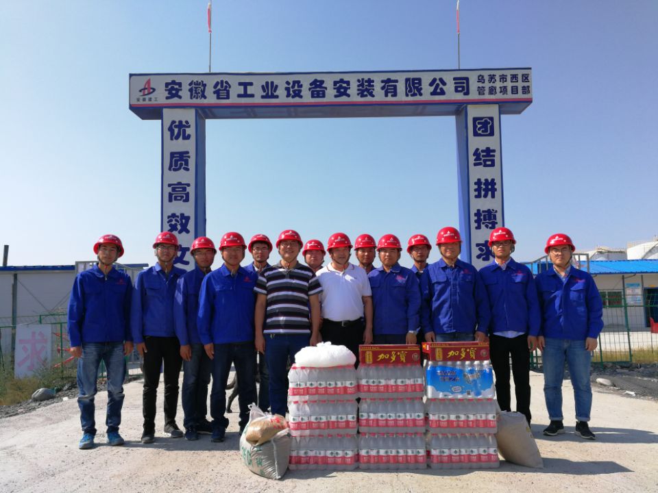 2018年7月21日下午,公司董事長(cháng)、總經(jīng)理、黨委副書(shū)記王軍邦、總會(huì )計師張元斌頂著(zhù)烈日驕陽(yáng)在公司總經(jīng)理助理、西北分公司經(jīng)理、新疆辦事處主任、項目經(jīng)理王軍的陪同下,深入新疆烏蘇市西區管廊工程項目部,為堅守在一線(xiàn)的員工送去礦泉水、綠豆、蕎麥、冰糖、藿香正氣水等防暑降溫慰問(wèn)品。
