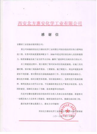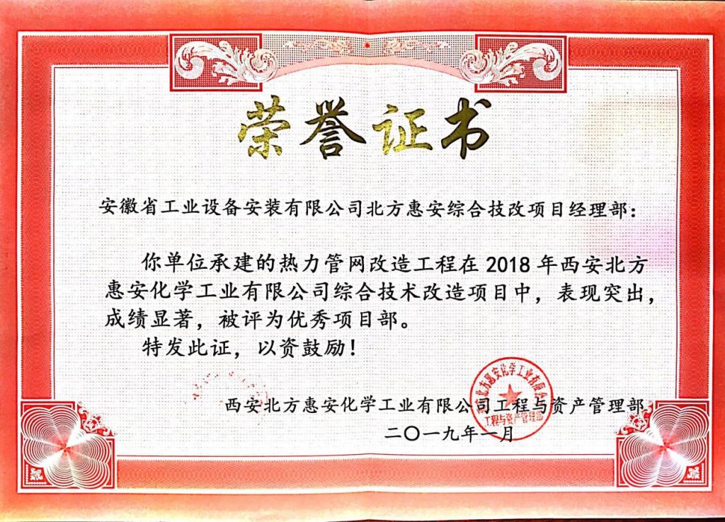 近日,安徽安裝承建的西安北方惠安化學(xué)工業(yè)有限公司綜合技改項目熱力管網(wǎng)改造工程,經(jīng)項目部全體人員共同努力,保質(zhì)保量地完成了業(yè)主的節點(diǎn)目標,贏(yíng)得了業(yè)主高度認可和好評,被業(yè)主授予“優(yōu)秀項目部”榮譽(yù)稱(chēng)號,成為各參建單位的標桿,業(yè)主特別頒發(fā)了榮譽(yù)證書(shū)和感謝信感謝項目全體人員所作出的貢獻,