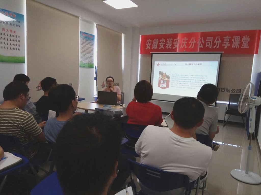 8月1日下午,安慶分公司黨支部充分利用分享課堂,組織全體員工開(kāi)展“不忘初心,牢記使命”主題教育之慶祝中國人民解放軍建軍92周年活動(dòng)。