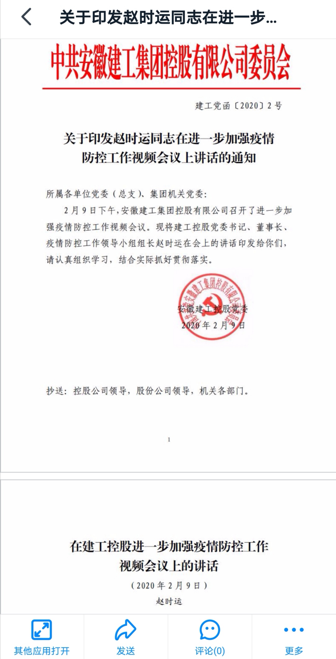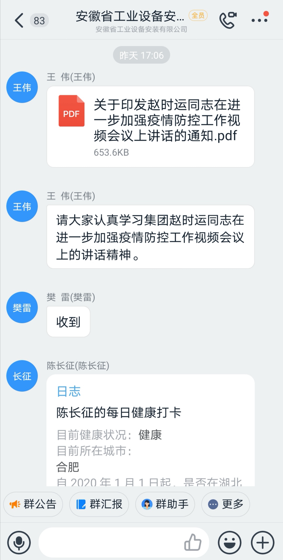 2月11日,安徽安裝公司通過(guò)釘釘日志、疫情防控群等網(wǎng)絡(luò )形式,迅速將《集團公司黨委書(shū)記、董事長(cháng)趙時(shí)運在進(jìn)一步加強疫情防控工作視頻會(huì )議上的講話(huà)》精神,傳達到每名職工,做到人人皆知,認真加以貫徹落實(shí)。