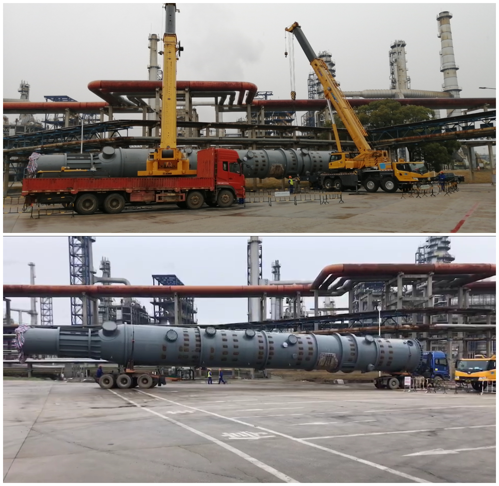 “Ⅰ、Ⅱ硫磺回收裝置增設煙氣后堿洗流程項目”能使煙氣SO2排放濃度從原先的50mg/m3下降至≤10mg/m3的環(huán)保工程。但該項工程僅一個(gè)脫硫塔下段就高達33米,重達58噸,體積十分龐大,而現場(chǎng)存在作業(yè)場(chǎng)地狹小,固有障礙物多、吊重荷載大等諸多問(wèn)題,無(wú)法將設備一次性運至施工現場(chǎng)并進(jìn)行下段焊接梯子、平臺等附塔“穿衣戴帽”作業(yè)。對此,項目部多次優(yōu)化倒運方案,提前合理部署,采用額定荷載分別為220噸和90噸的汽車(chē)吊實(shí)施雙機抬吊作業(yè)和專(zhuān)為公路橋梁設計使用的炮車(chē)運輸,從而順利完成了倒運工作。同時(shí),為爭取時(shí)間,安排班組實(shí)行夜間倒班制,管理人員輪班制,為接下來(lái)的脫硫塔“穿衣戴帽”和上下段空中組對焊接作業(yè)爭取了寶貴時(shí)間。