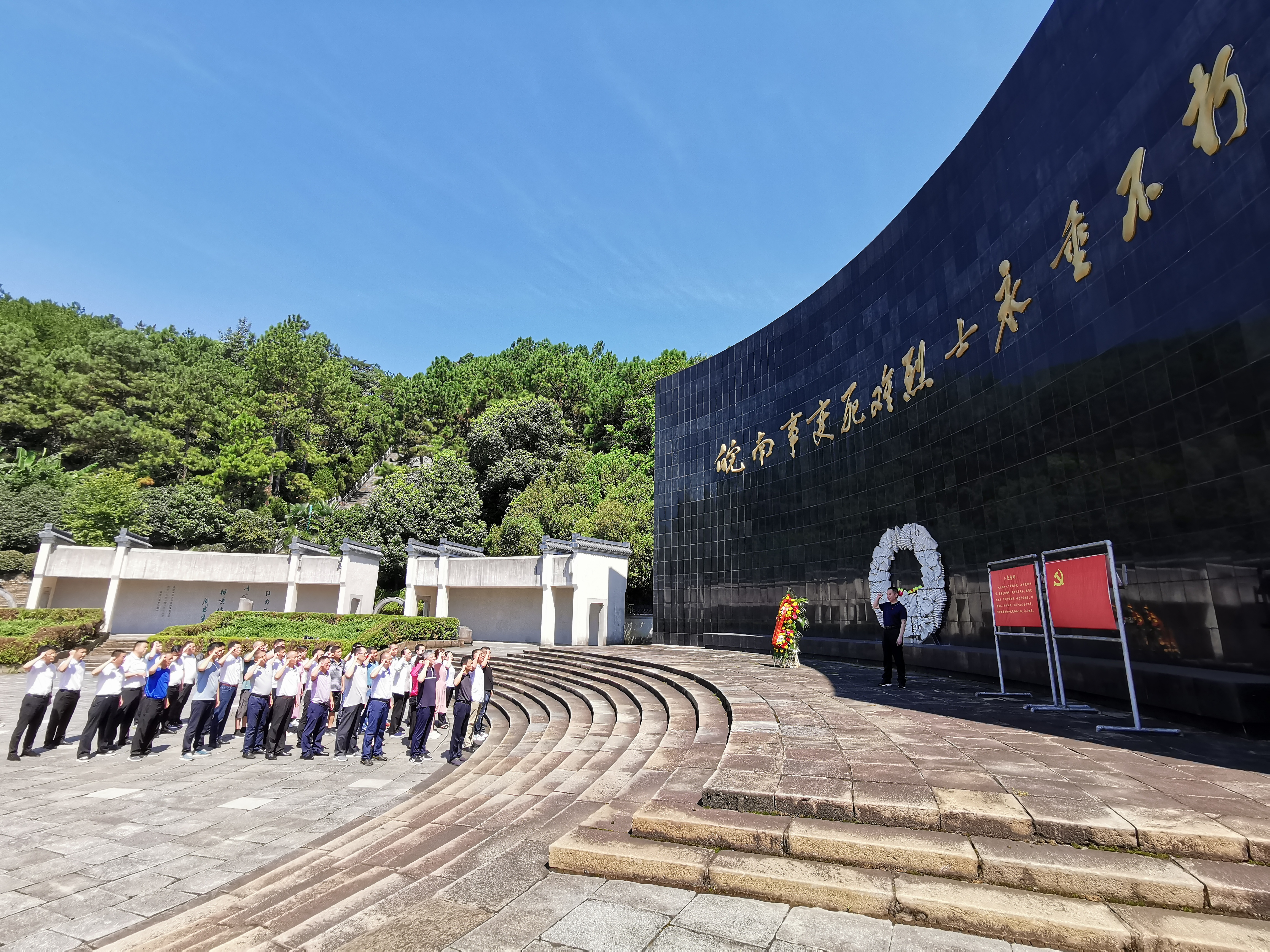 在莊嚴肅穆的皖南事變烈士陵園內,大家認真聽(tīng)取講解員的講解,詳細了解新四軍發(fā)展壯大、英勇抗日的光輝歷程,在“皖南事變死難烈士永垂不朽”紀念碑下,在低沉肅穆的哀樂(lè )聲中,向烈士三鞠躬、默哀。并向英勇?tīng)奚牧沂總兙传I花籃,同志們莊嚴的舉起右拳,重溫了入黨誓詞。在新四軍軍部舊址,一件件珍貴的文物、一幅幅生動(dòng)的照片、一段段感人的事跡讓大家仿佛置身于那戰火紛飛的年代,深刻感受到新四軍波瀾壯闊的戰斗歷史,親身感受到革命先輩們?yōu)楦锩硐霋侇^顱灑熱血的獻身精神。
