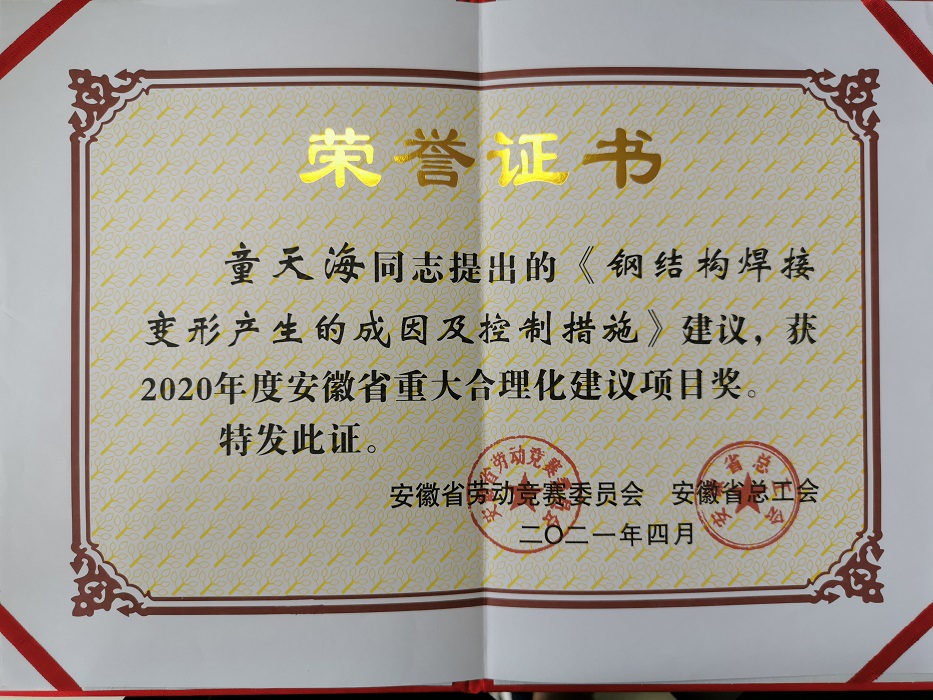 近日,由安徽省勞動(dòng)競賽委員會(huì )和安徽省總工會(huì )聯(lián)合評選的“2020年度安徽省重大合理化建議項目獎”揭曉,安徽安裝公司童提出的《鋼結構焊接變形產(chǎn)生的成因及控制措施》成功入選。