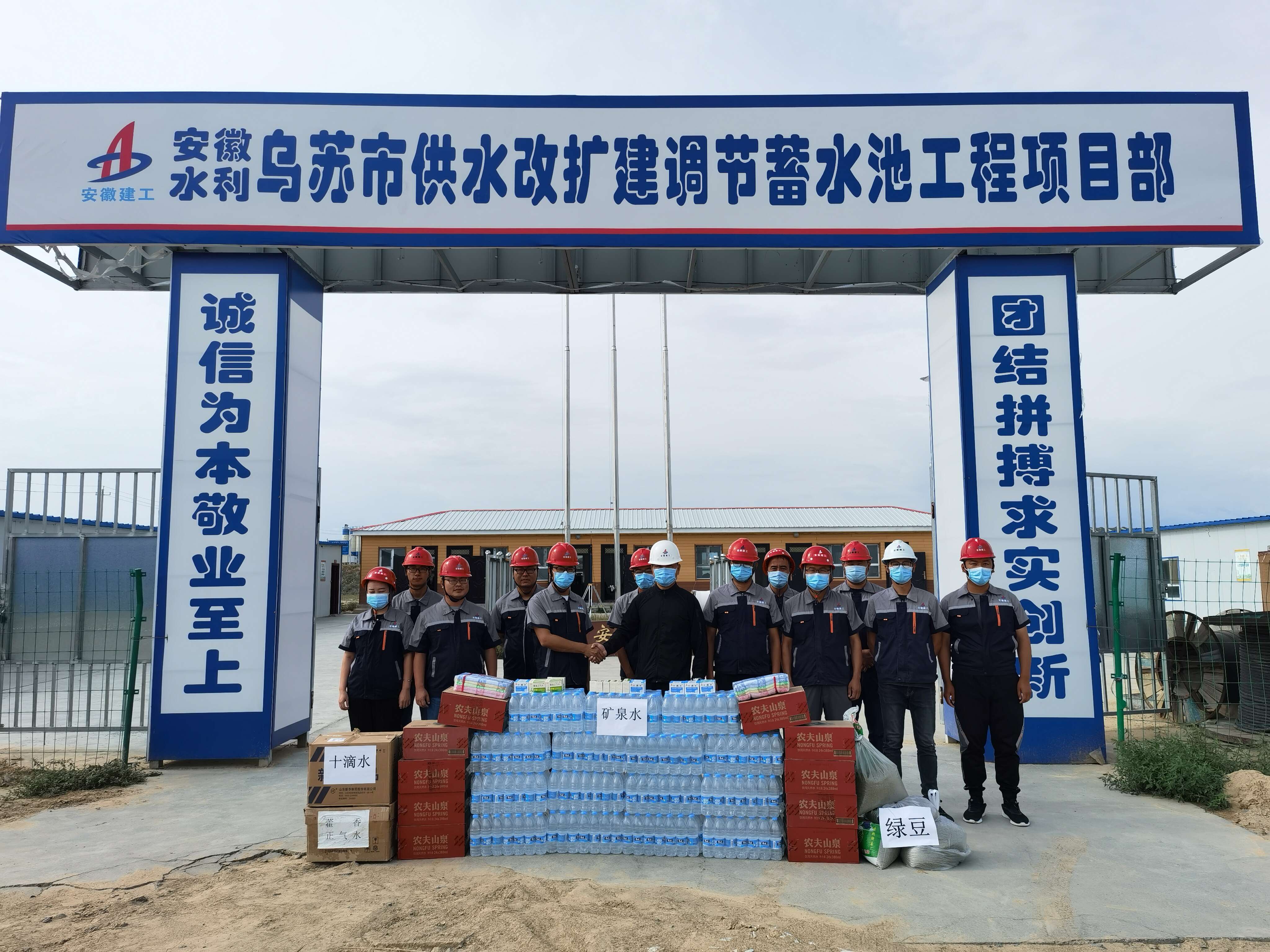 2021年7月14日上午,公司副總經(jīng)理王軍赴烏蘇市供水改擴建調節蓄水池項目“送清涼”,將礦泉水、綠豆、冰糖、藿香正氣水、十滴水、毛巾、香皂等防暑降溫物品送到一線(xiàn)員工手中。