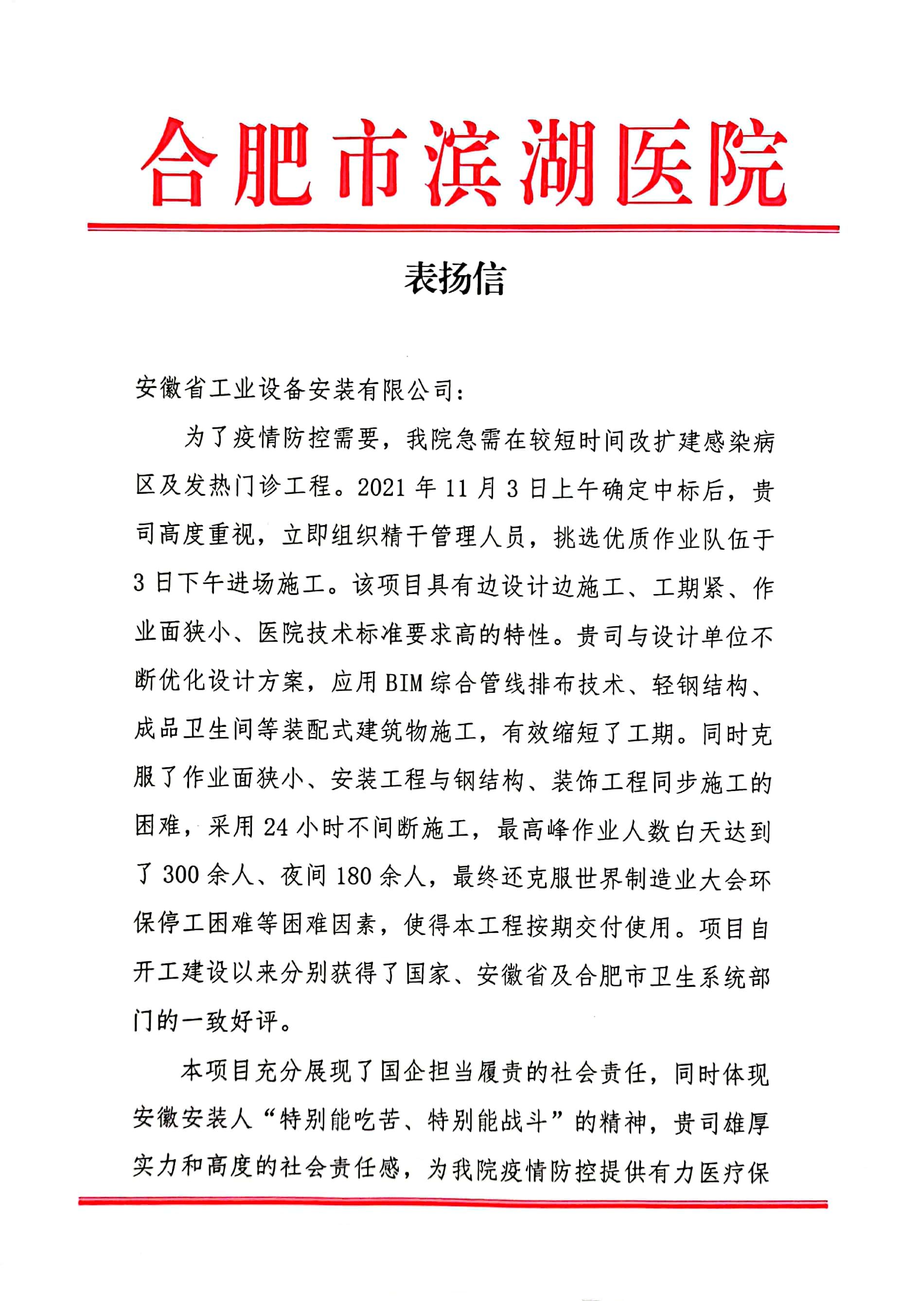 近日,安徽安裝公司收到合肥市濱湖醫院表?yè)P信,信中高度贊揚公司濱湖醫院感染病區及發(fā)熱門(mén)診應急改造工程設計施工一體化方艙醫院項目克服重重困難,縮短工期,一個(gè)月的時(shí)間內按期交付使用。該項目充分展現了安徽安裝作為國有企業(yè)擔當履責的社會(huì )責任,為合肥市打贏(yíng)防疫攻堅戰奠定了堅實(shí)基礎。
