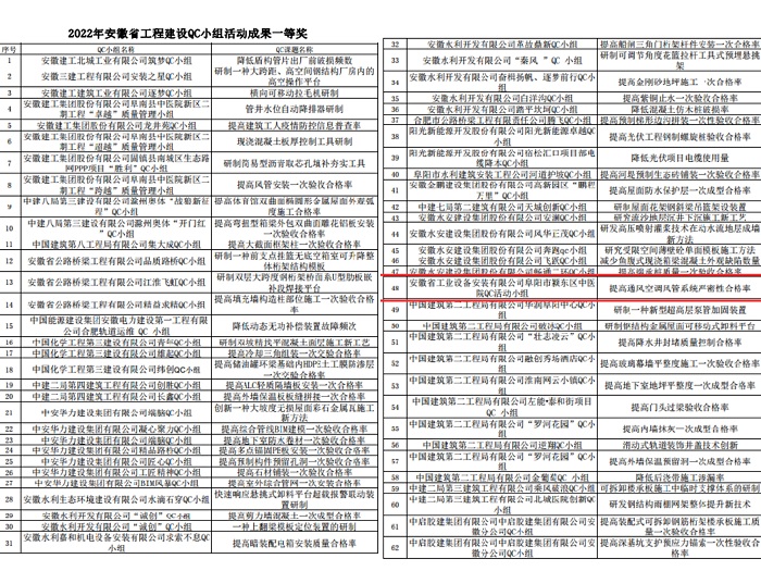 近日,從安徽省建設行業(yè)質(zhì)量與安全協(xié)會(huì )傳來(lái)喜訊,協(xié)會(huì )發(fā)布的《關(guān)于2022年安徽省工程質(zhì)量管理小組及質(zhì)量信得過(guò)班組建設活動(dòng)成果的通知》文件中,安徽安裝公司共獲得11項安徽省工程建設QC小組活動(dòng)成果獎項。