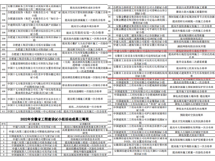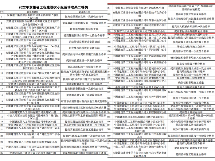 其中安徽安裝公司阜陽(yáng)市潁東區中醫院QC活動(dòng)小組完成的《提高通風(fēng)空調風(fēng)管系統嚴密性合格率》榮獲2022年安徽省工程建設QC小組活動(dòng)成果一等獎。安徽安裝公司安徽省安暖通QC攻關(guān)小組完成的《提高不銹鋼空調供回水管質(zhì)量合格率》、鋼結構QC小組完成的《提高重型鋼結構廠(chǎng)房雙“H”型鋼柱杯口基礎的安裝精度》等六項課題榮獲2022年安徽省工程建設QC小組活動(dòng)成果二等獎。安徽安裝公司公司邊坡鉆孔QC小組完成的《提高碎礫石地層邊坡網(wǎng)施工一次鉆孔的成孔率》、安慶石化項目技術(shù)攻關(guān)QC小組完成的《提升設備基礎二次灌漿質(zhì)量》等四項課題榮獲2022年安徽省工程建設QC小組活動(dòng)成果三等獎。