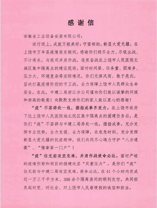 全力抗疫援建 暖心行動(dòng)獲贊——安徽安裝再收感謝信