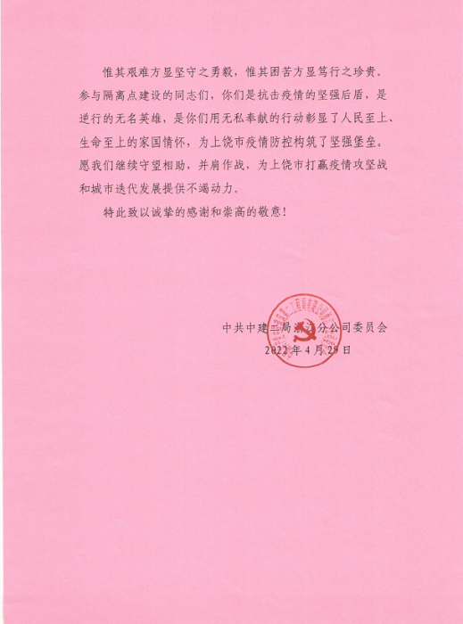 信中對安徽安裝公司與中建二局浙江分公司共同援建上饒市人民醫院北城區集中隔離點(diǎn)給予高度的肯定和認可。當前,新冠疫情形勢嚴峻,安徽安裝公司在嚴格落實(shí)屬地疫情防控措施的同時(shí),一方面積極參與本地區隔離點(diǎn)、醫院發(fā)熱門(mén)診的緊急建設任務(wù);另一方面攜手相關(guān)行業(yè)兄弟單位同心協(xié)力、援建市外防疫區域,承擔起國有企業(yè)社會(huì )責任,竭盡所能地為防疫建設貢獻最大的力量!
