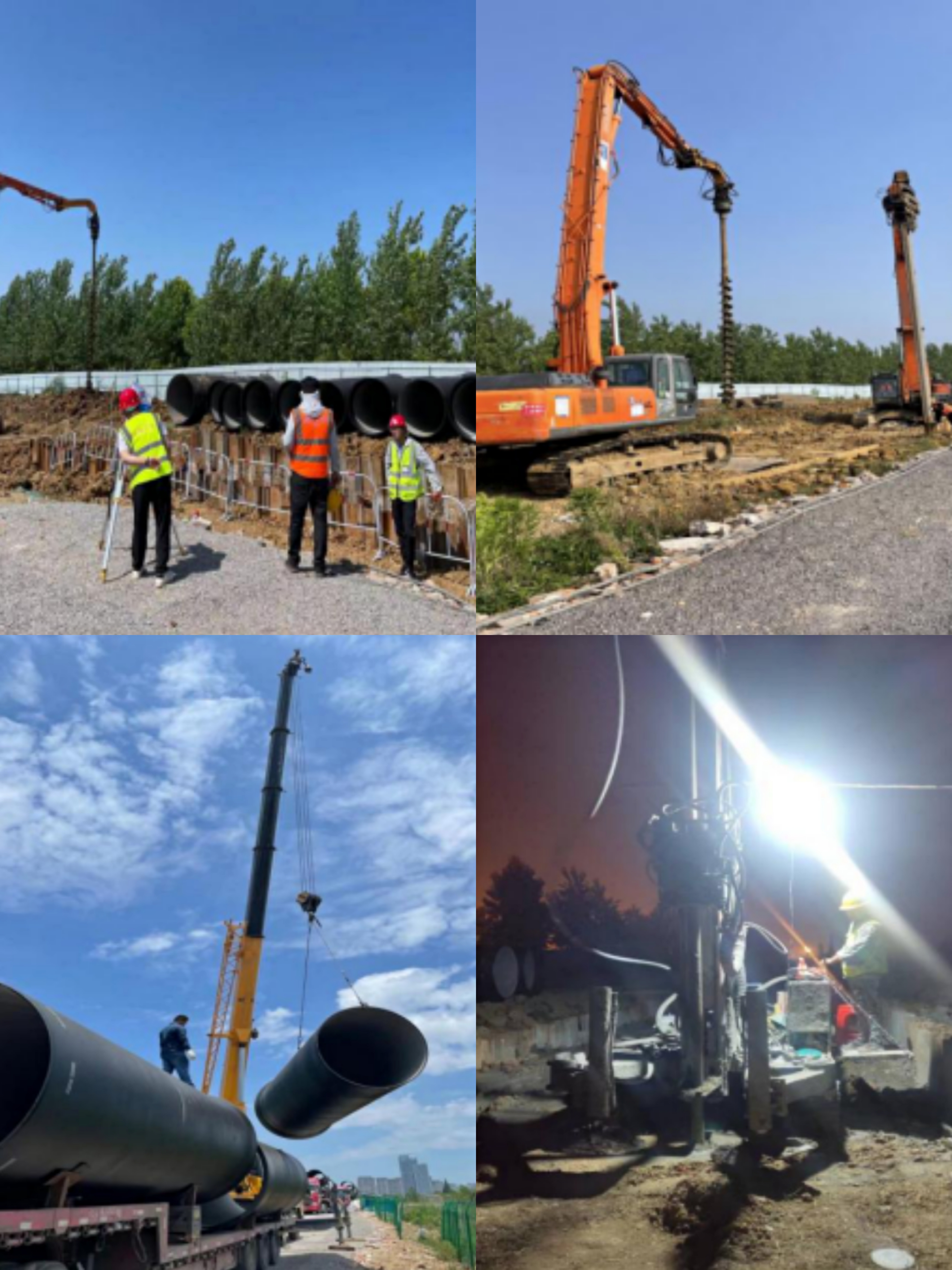 圖為市政分公司四水廠(chǎng)DN1800、DN1400供水管道遷建工程項目現場(chǎng)砂墊層夯實(shí)、測量;對球墨鑄鐵管進(jìn)行吊裝;為搶施工進(jìn)度夜間施工壓密注漿。