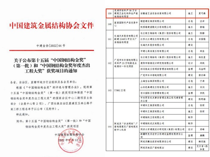 7月12日,中國建筑金屬結構協(xié)會(huì )公布第十五屆“中國鋼結構金獎”(第一批)獲獎項目。由安徽安裝公司承建的蕪湖宇培年產(chǎn)50萬(wàn)方建筑工業(yè)化構件生產(chǎn)基地鋼結構項目獲此殊榮。
