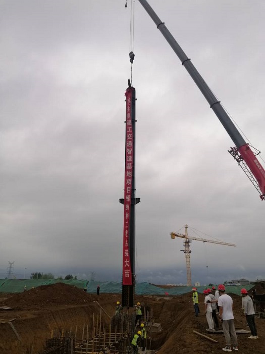 2022年7月26日上午8:18分,在項目建設單位、監理單位、總包單位等領(lǐng)導的共同見(jiàn)證下,安徽建工交通智造基地項目鋼結構工程迎來(lái)了隆重的鋼結構首吊儀式。只見(jiàn)首根長(cháng)約21.2米、重約11.6噸的鋼柱緩緩升起、穩穩落地,精準定位在安裝位置上,這標志著(zhù)該項目正式進(jìn)入鋼結構主體安裝階段。