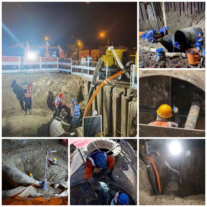 合肥四水廠(chǎng)新建的DN1800、DN1400分別為原水管和清水管兩條供水管線(xiàn)。DN1400清水管道之前已完成勾點(diǎn),這次需要對新建DN1800原水管道進(jìn)行停水勾點(diǎn)。停水勾點(diǎn)會(huì )直接影響到附近居民的生活用水,因此有嚴格的時(shí)間限制,要求項目部必須提前做好充分準備,在規定的時(shí)段內,不間斷連續作業(yè),按時(shí)完成搶工任務(wù)。這也是對單位施工能力的重要考驗。