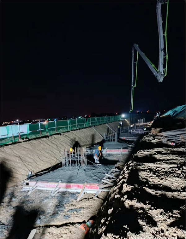 圖為夜間安徽建工交通智造基地建設項目鋼結構承臺混凝土澆筑場(chǎng)景