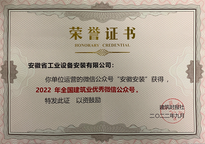 9月25日,由建筑時(shí)報社主辦的2022年建筑業(yè)微信公眾號運維經(jīng)驗交流研討會(huì )暨全國建筑業(yè)優(yōu)秀微信公眾號頒獎典禮在武漢召開(kāi)。公司微信公眾號“安徽安裝”榮獲“2022年全國建筑業(yè)優(yōu)秀微信公眾號”榮譽(yù)。
