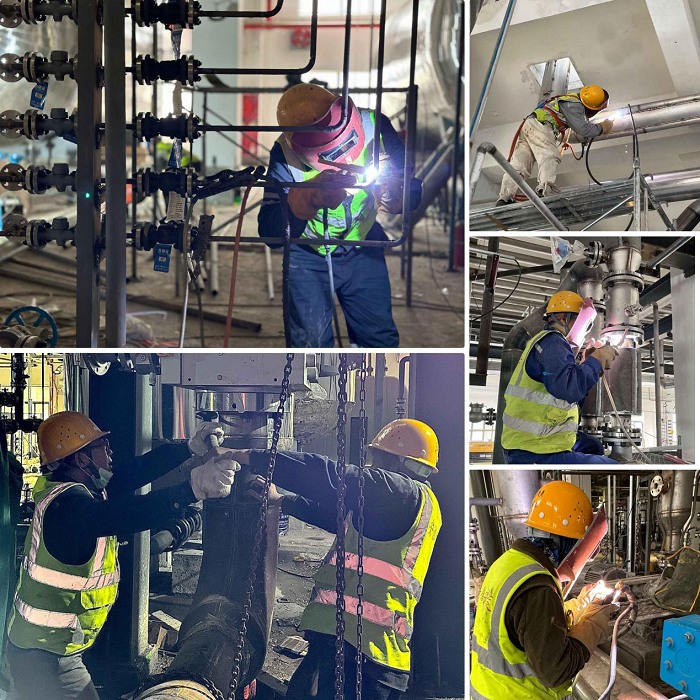 面對建設單位準備在5月下旬進(jìn)行試生產(chǎn)的目標任務(wù),車(chē)間內新增管線(xiàn)是否能夠按時(shí)完成就成為確保試生產(chǎn)順利進(jìn)行的最大難題。為此,項目部精心組織、加強協(xié)調,認真部署,通過(guò)多次召開(kāi)碰頭會(huì )最終達成最優(yōu)施工進(jìn)度方案,做到明確每日進(jìn)度內容,合理安排施工人員,積極做好施工現場(chǎng)各項安全防護工作,在保證原有工程量的基礎上,對新增管線(xiàn)進(jìn)行科學(xué)分解,新增突擊作業(yè)隊,采用“5+2”“白加黑”,多個(gè)小組多工作面同時(shí)施工的方法,開(kāi)足馬力快速推進(jìn),從而大大提高了施工速度,提升了工作效率。