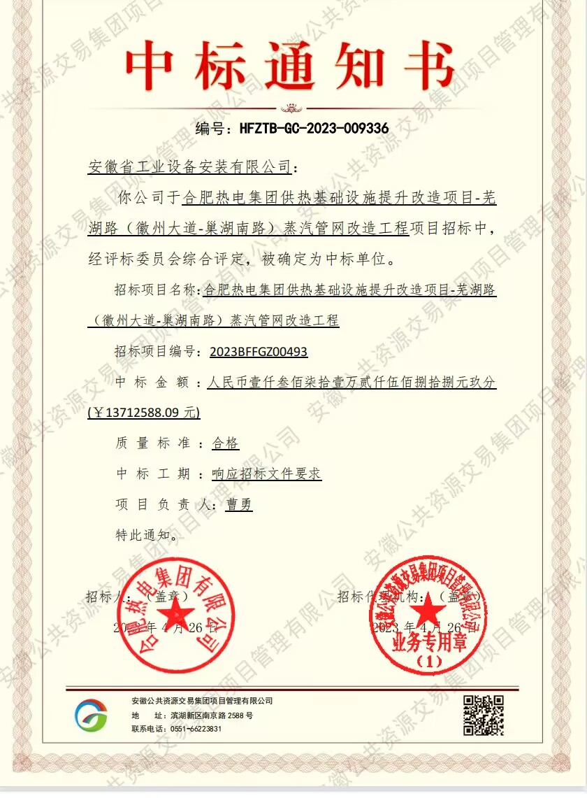 近日,安徽安裝市政分公司收到安徽公共資源交易平臺發(fā)來(lái)的中標通知書(shū),成功中標合肥熱電集團供熱基礎設施提升改造項目-蕪湖路(徽州大道-巢湖南路)蒸汽管網(wǎng)改造工程,中標金額1371.25萬(wàn)元。