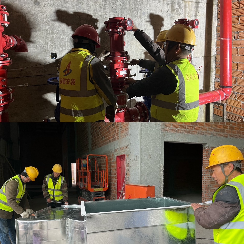 圖為:岳西中學(xué)建設項目(一期)安裝專(zhuān)業(yè)分包工程項目正在進(jìn)行地下室濕式報警閥安裝、體育館風(fēng)管加工
