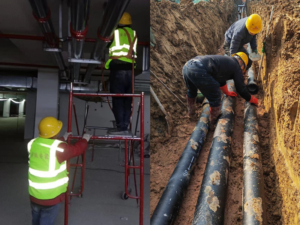 圖為:合肥高鐵路初中及高鐵路小學(xué)項目正在進(jìn)行室內消防管道安裝,室外給水管網(wǎng)施工