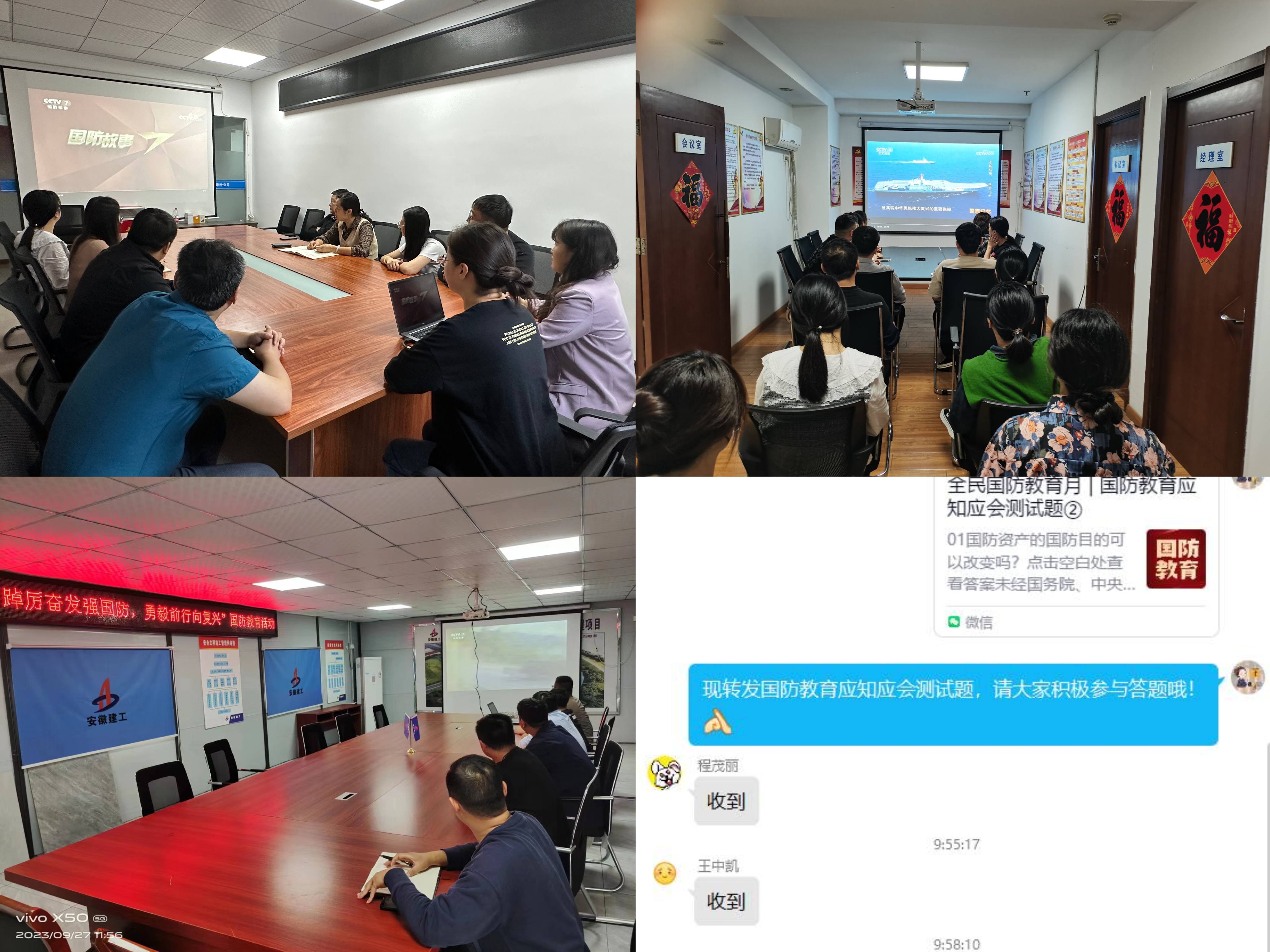 公司各級黨組織通過(guò)中心組學(xué)習會(huì )、紅色教育實(shí)景課堂、退伍軍人職工座談交流、紅色觀(guān)影、國防知識問(wèn)答等多種形式,營(yíng)造出關(guān)心國防、熱愛(ài)國防、建設國防、保衛國防的濃厚氛圍,廣大職工紛紛表示要樹(shù)立國防觀(guān)念,賡續紅色血脈,立足崗位、恪盡職守、錘煉本領(lǐng),為推進(jìn)奮力開(kāi)創(chuàng )安徽建工集團大發(fā)展、轉型發(fā)展、高質(zhì)量發(fā)展新局面而不懈奮斗。