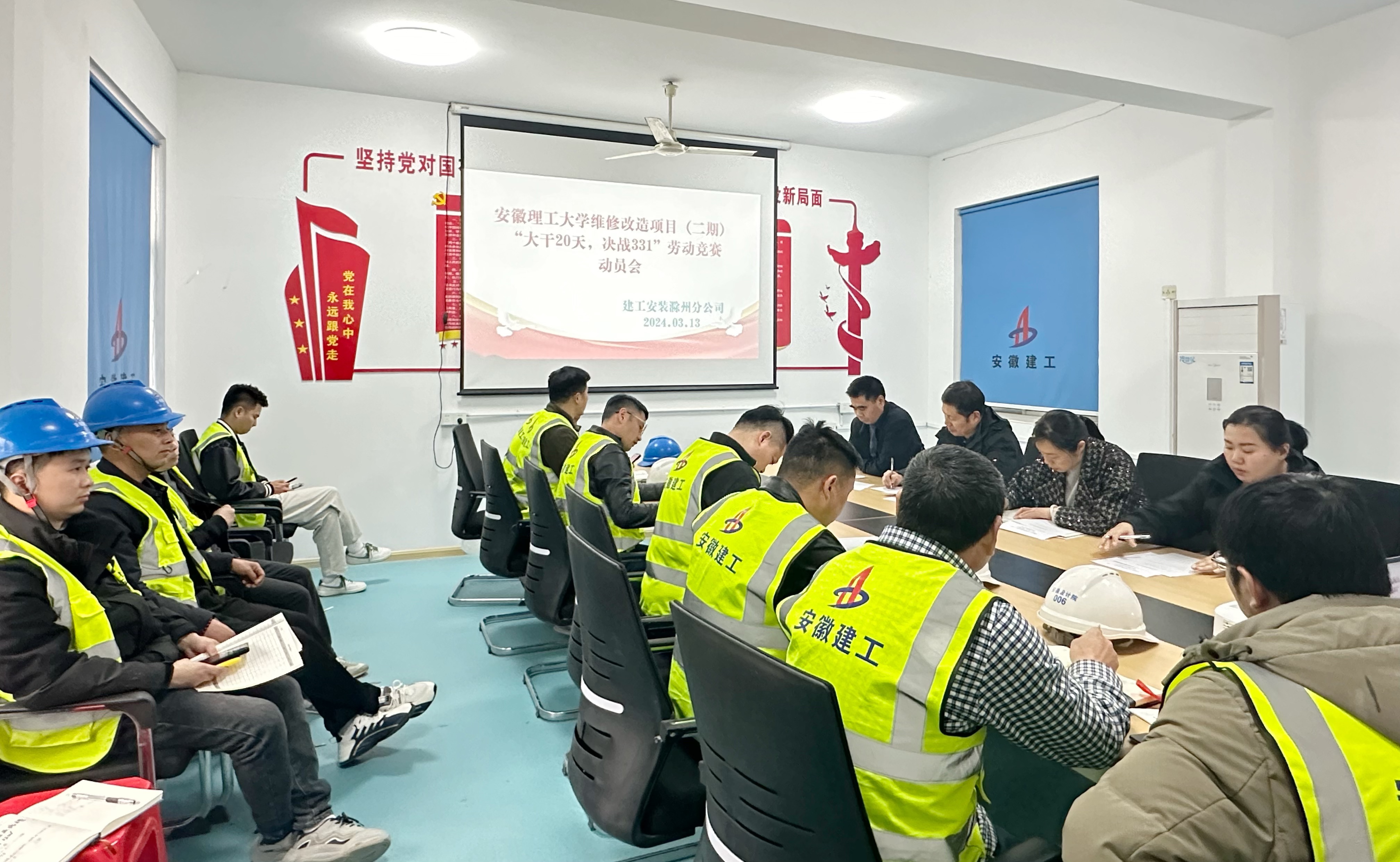 為深入學(xué)習貫徹集團三屆一次職代會(huì )暨2024年工作會(huì )議和公司十七屆四次職代會(huì )精神,全面落實(shí)“項目管理強化年”工作部署和集團2024年度“當好主人翁建功大發(fā)展”勞動(dòng)競賽活動(dòng)相關(guān)要求,3月13日下午,滁州分公司安徽理工大學(xué)維修改造(二期)項目在項目部現場(chǎng)召開(kāi)了“大干20天、決戰3.31”勞動(dòng)競賽動(dòng)員會(huì )。分公司黨支部書(shū)記、副經(jīng)理程茂麗,副經(jīng)理張漢軍等勞動(dòng)競賽領(lǐng)導小組成員出席會(huì )議,項目部全體管理人員及施工班組代表參會(huì )。