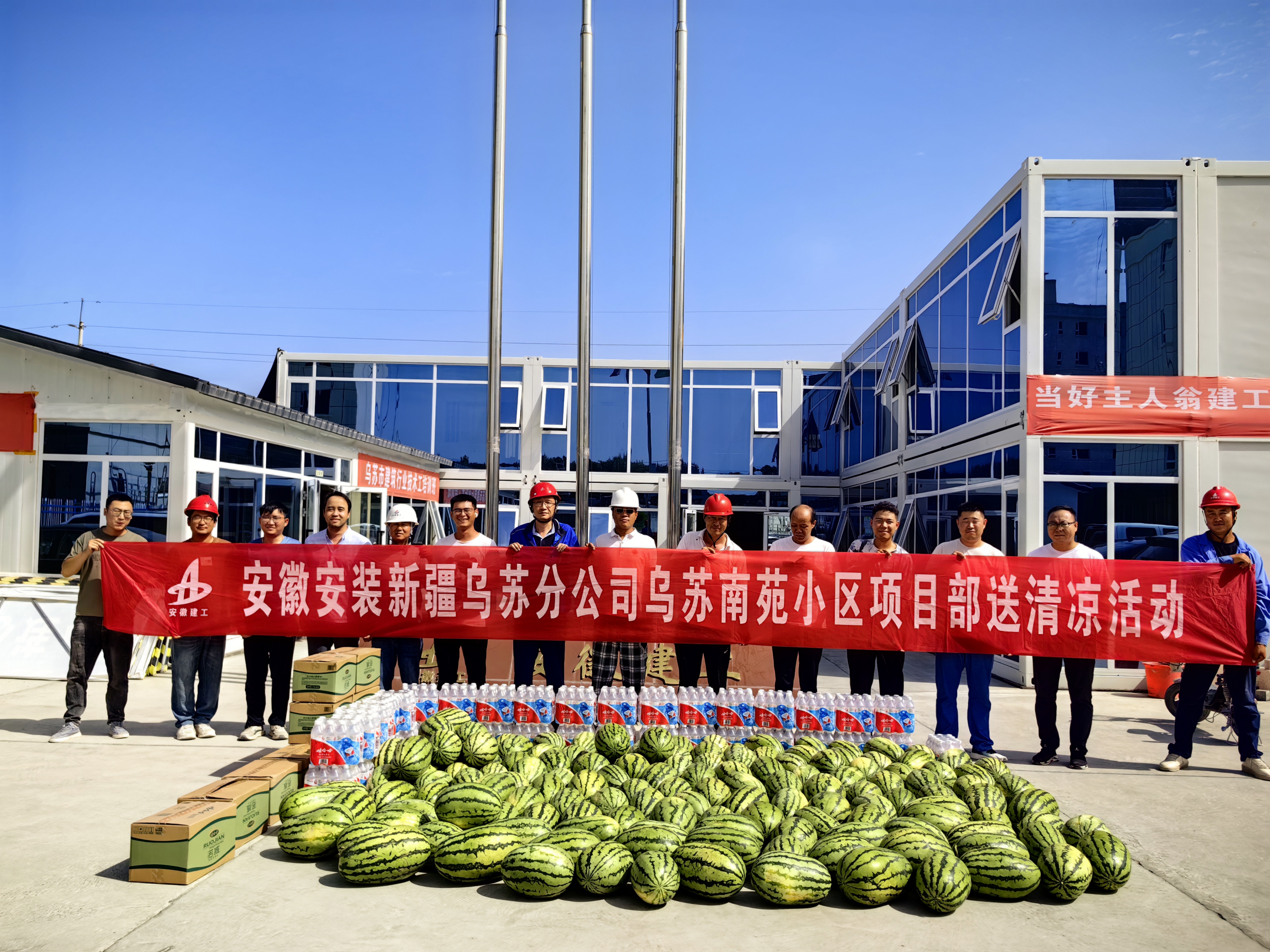 炎炎夏日,驕陽(yáng)似火。近日,隨著(zhù)新疆地區氣溫的逐漸攀升,建工安裝新疆烏蘇分公司工會(huì )赴烏蘇南苑新城項目部開(kāi)展“送清涼”慰問(wèn)活動(dòng)。為了幫助員工保持良好的工作狀態(tài),分公司工會(huì )將精心準備的西瓜、礦泉水等夏日清涼物資送往施工現場(chǎng),為參建員工們帶來(lái)絲絲清涼和關(guān)懷。