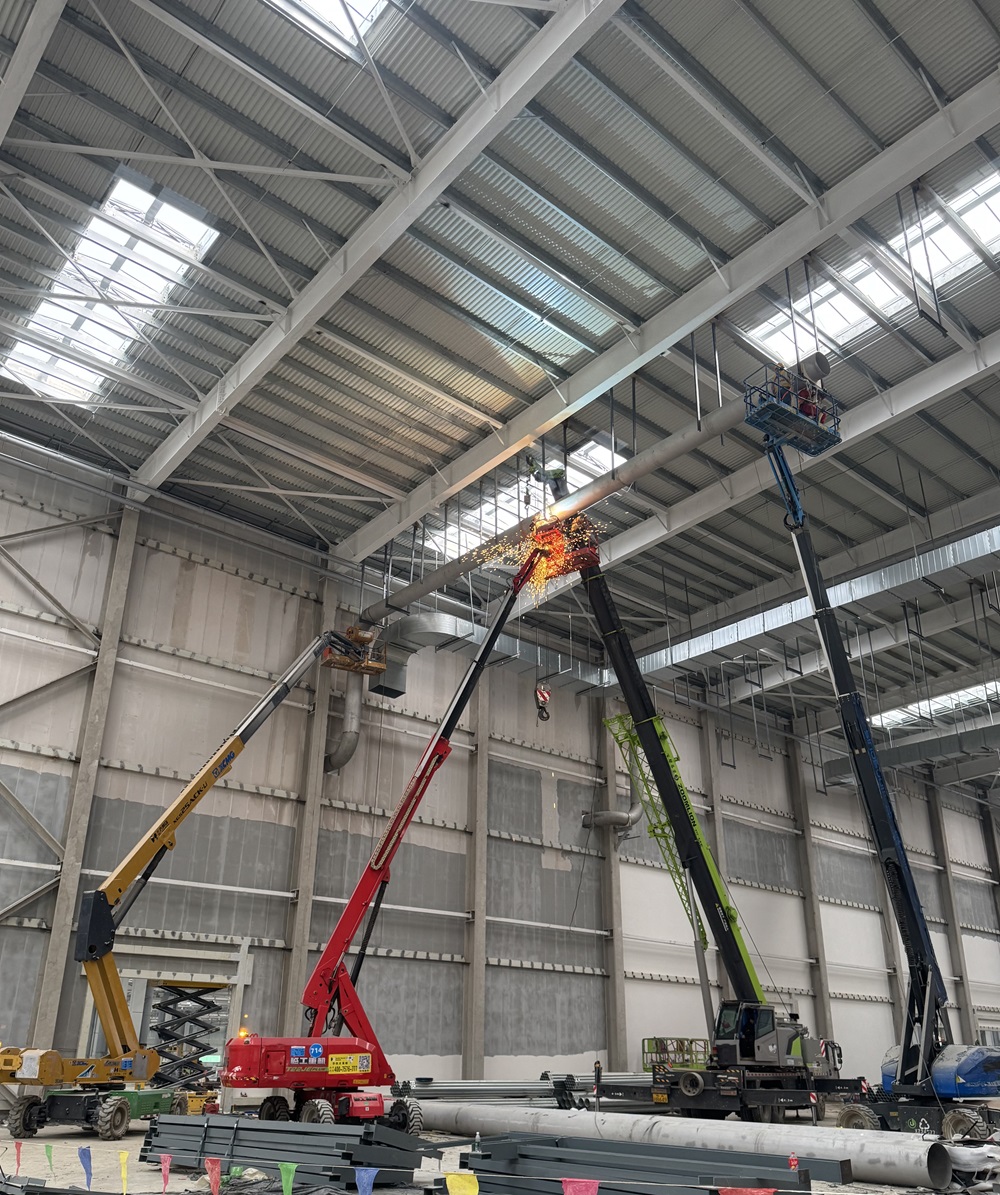 為確保施工有序高效運行,項目部嚴格按照總體工期計劃部署施工任務(wù),加大人力、材料、機械投入,組織多個(gè)工作面同時(shí)展開(kāi)施工,確保工程各節點(diǎn)進(jìn)度有效推進(jìn)。截至目前,沖壓車(chē)間架空循環(huán)水主管道已安裝完成進(jìn)入介質(zhì)間。車(chē)間一閣樓空調水主管安裝完成3600米,管道風(fēng)機安裝65臺,組空安裝4臺,閣樓配電房移交3個(gè),配電柜安裝90臺,橋架安裝1500米,電線(xiàn)電纜安裝10000余米,各種燈具安裝200盞,消防報警設備安裝160套。