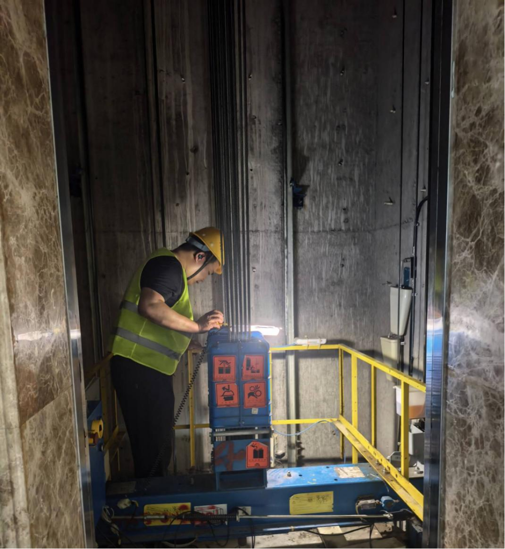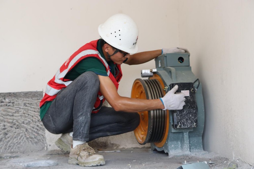 桃花科創(chuàng )產(chǎn)業(yè)園EPC項目施工人員正在調試電梯主機平衡度