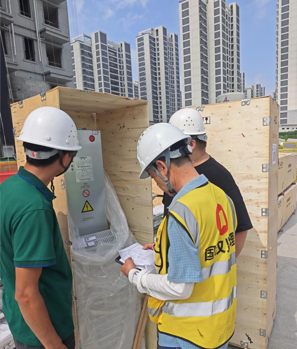 長(cháng)豐縣雙墩鎮紫桐苑項目項目管理人員正在對電梯開(kāi)箱核對數據參數